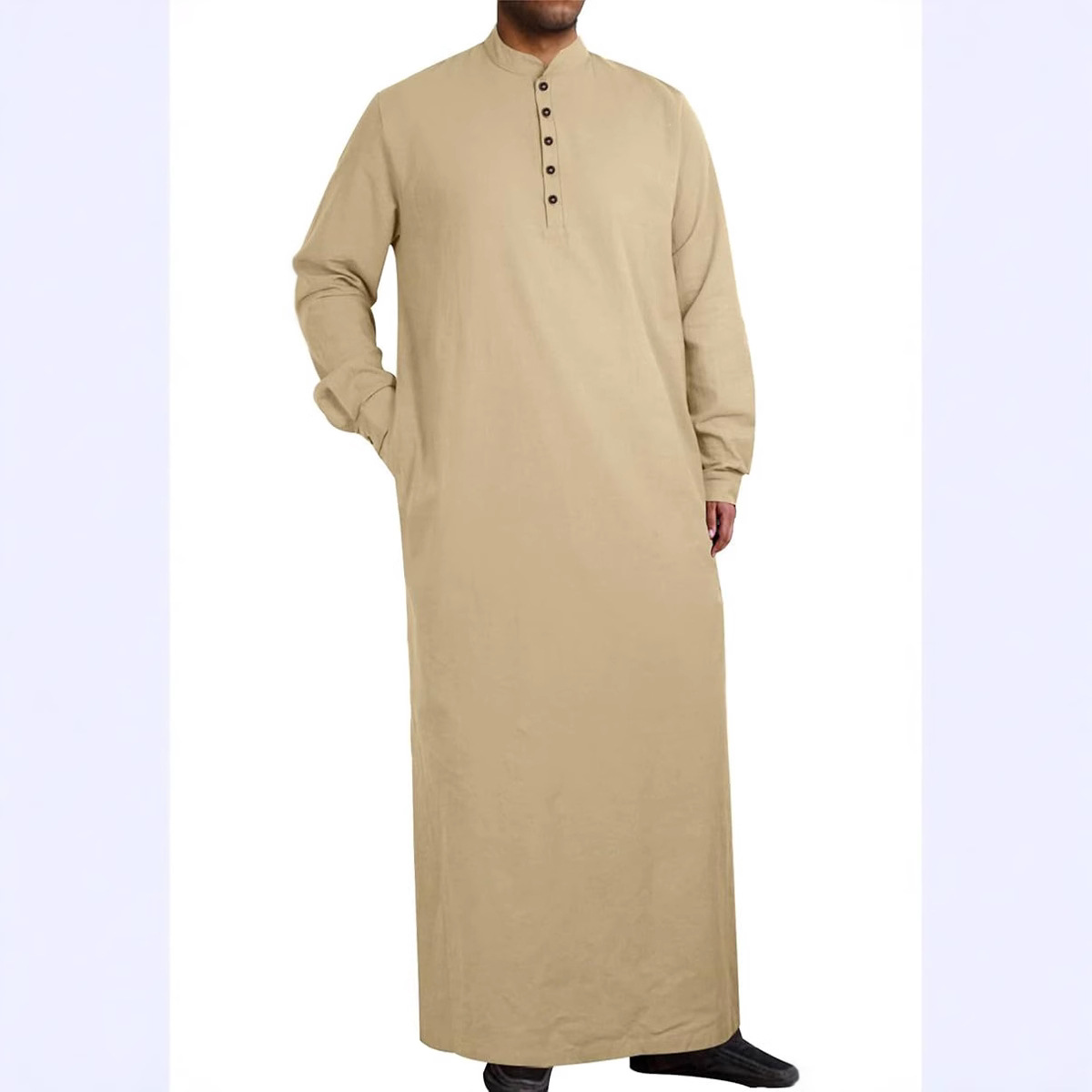 2025 新しいクロスボーダーアマゾンメンズスタンドカラーコットンとリネンローブメンズシンプルロングイスラム教徒ローブオープンなし