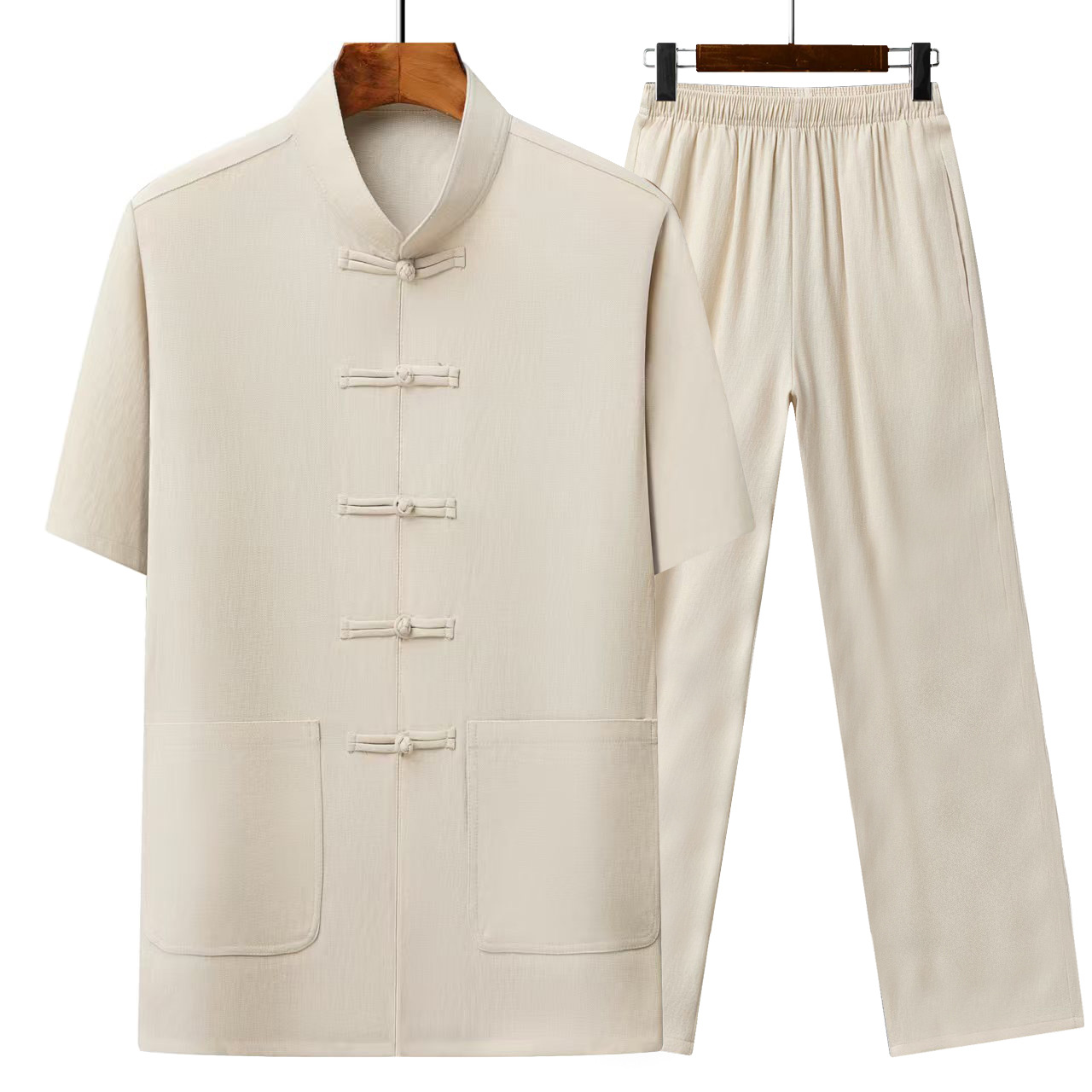 唐装男中老年父半袖セット竹節綿麻薄金通気禅修中医理学療法揉み半袖