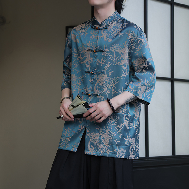夏の新しい中国風の紳士服プリント唐装漢服半袖五分袖シャツドロップシッピング