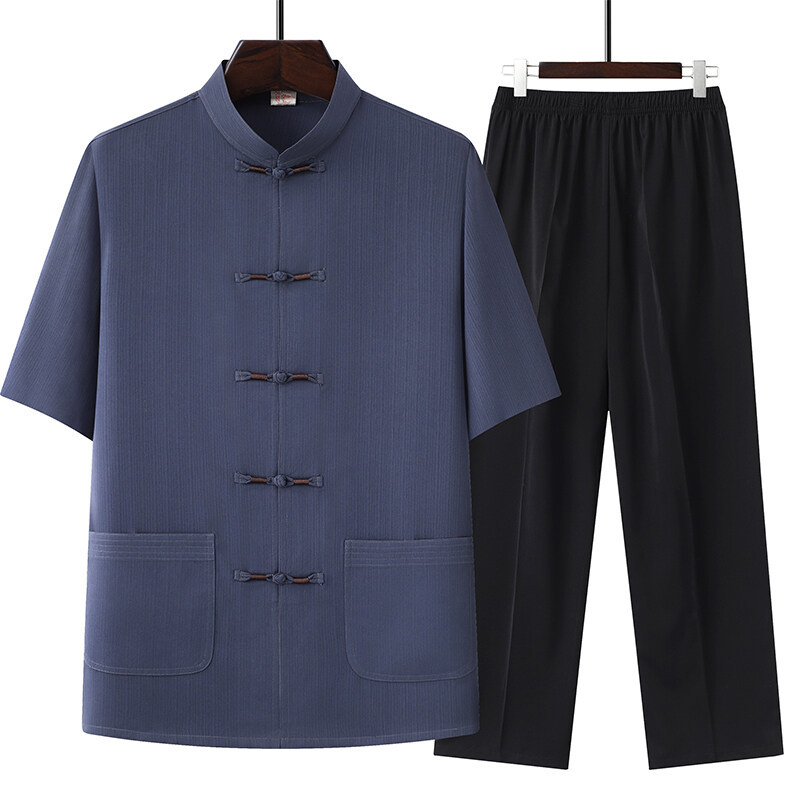 氷糸唐装男性中高年半袖シャツおじいさんセット中国風お父さん夏服薄手中国式服