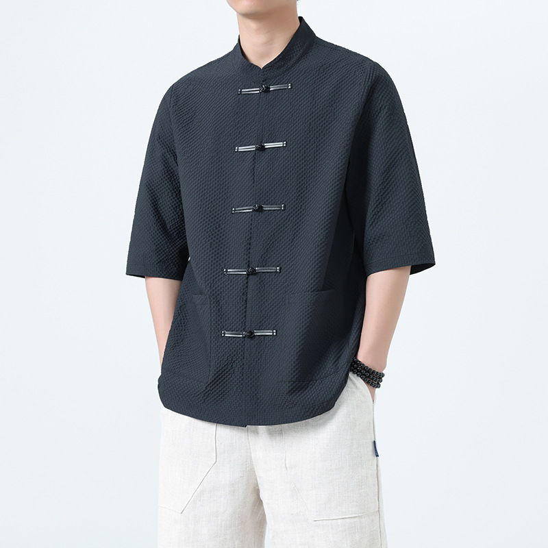 2025中国風夏の新型ワッフル半袖シャツの男性服の大きいサイズのファッションの薄いタイプのレトロなバックルの上着