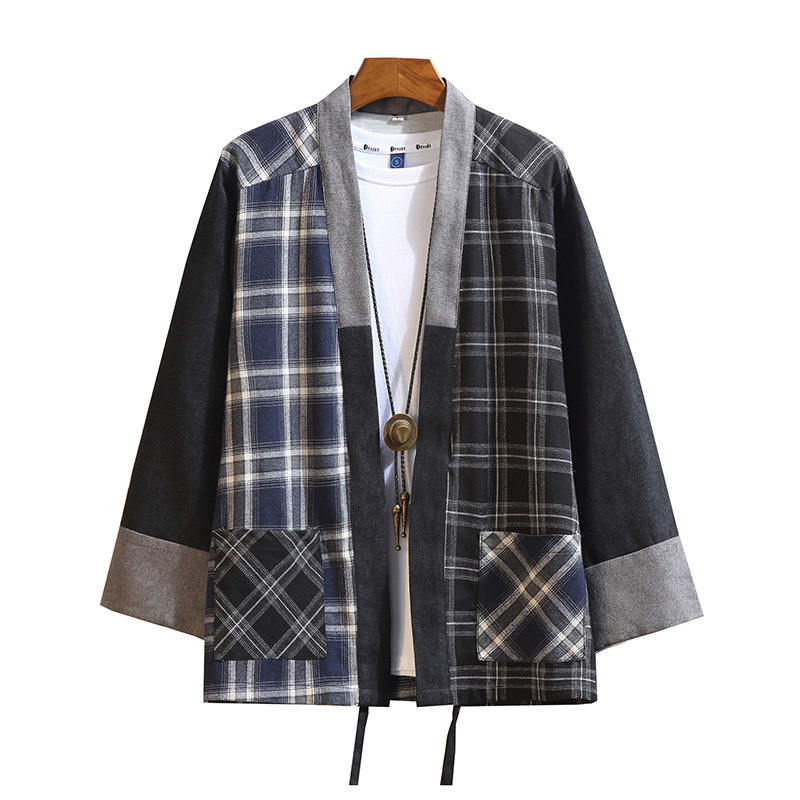 2024中国風の男性のレトロな潮流は色の格子のカーディガンの着物の道着の百合のカーディガンの7分の袖をつなぎ合わせます。