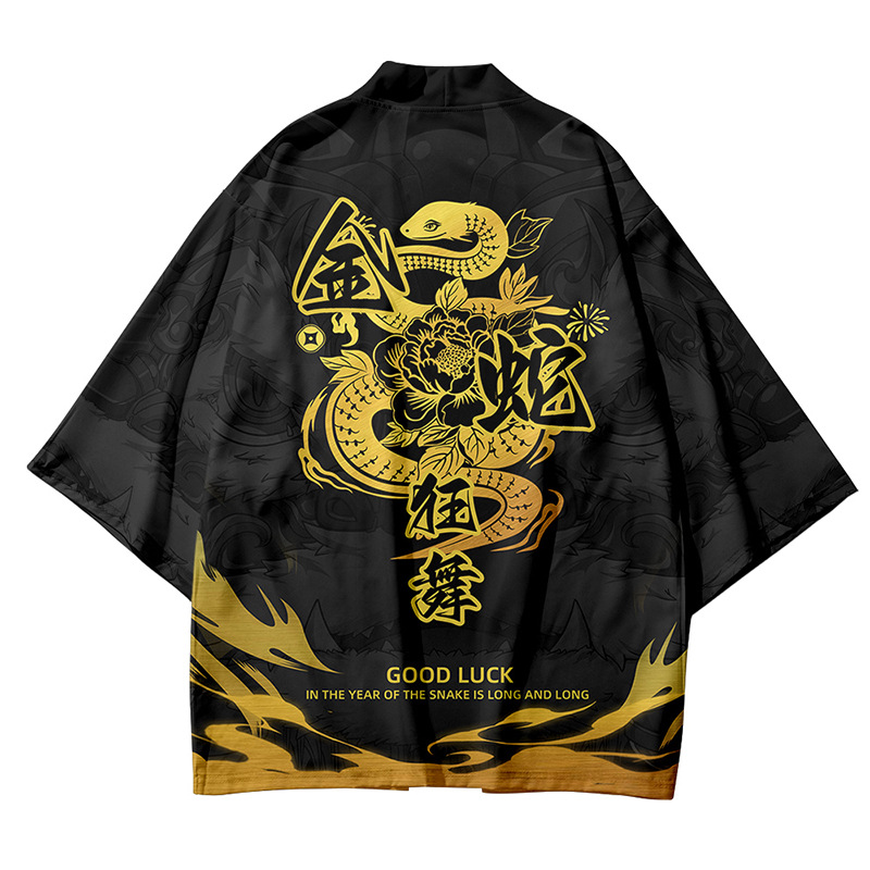氷鉄サメ夏着物クロスボーダー中国風国潮金蛇狂舞小金蛇プリントゆるい男羽織黒