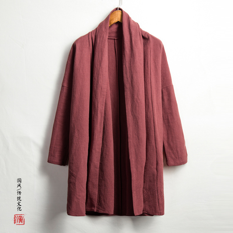 秋冬の新型中国風メンズ純色亜麻漢服男性綿麻ファッションの中の長めのウインドブレーカーのコートの卸売り