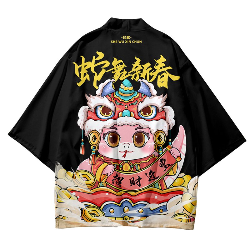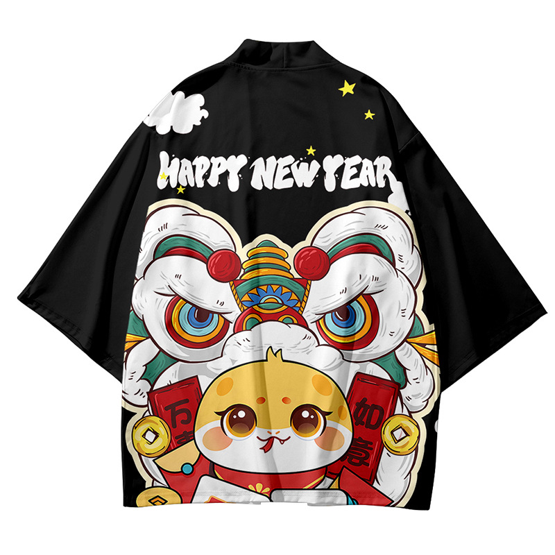 氷鉄サメ夏着物クロスボーダー中国風国潮蛇舞新春覚醒獅子プリント黒ゆるい男羽織
