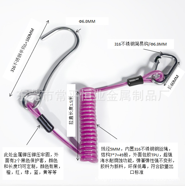 深海潜水カメラ紛失防止装置316ステンレスシングルフック + 簡易フックスプリングロープ