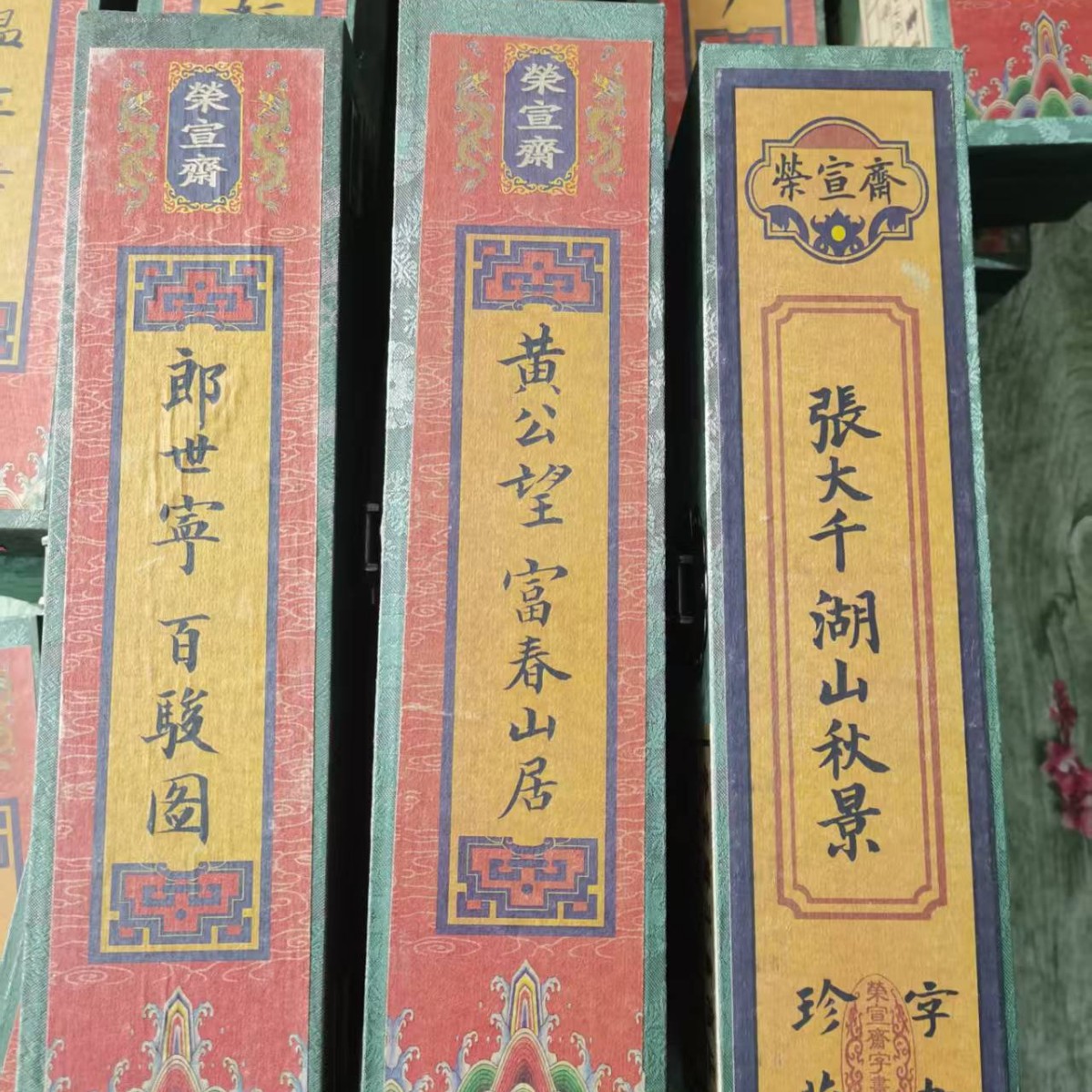 紫宣斎は古人の書画をまねて山水富春山居図の箱入りのシールにロックをかけて古風に書画工芸をします。
