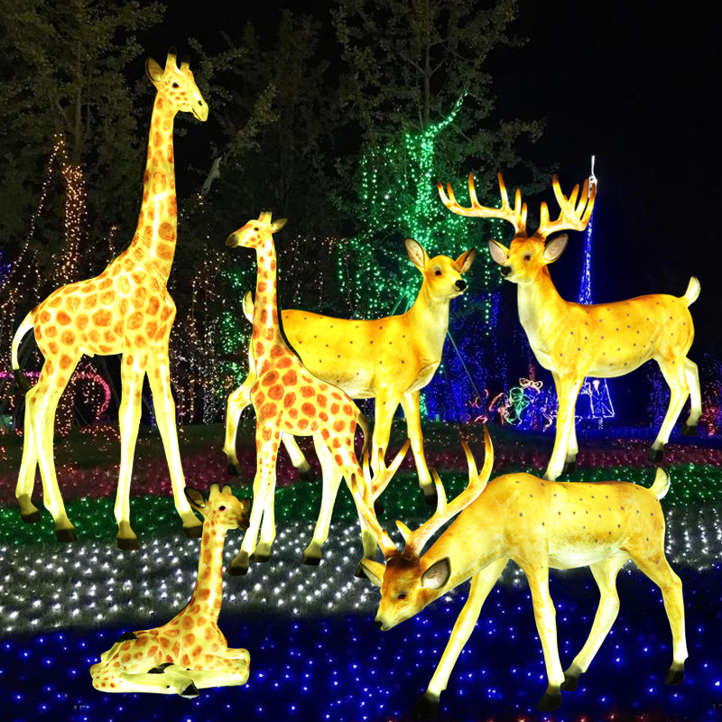 光るニホンジカの明かりの彫刻の屋外の公園の芝生は明るくなって動物の明かりをシミュレーションします。