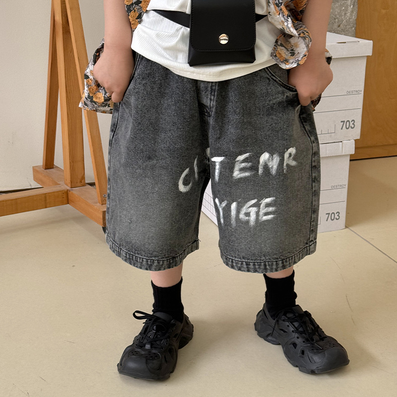 鴻製服で夏の子供用デニムパンツ2025子供服の新型男の子の手描きのアルファベットを合わせてズボンの男の子に合わせます。