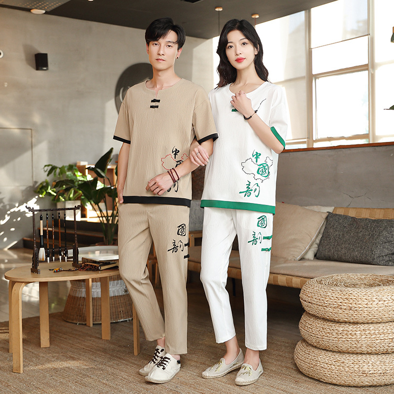 越境夏刺繍中国風男性唐装漢服ファッション盤ボタン半袖長ズボン綿麻復古風スーツ