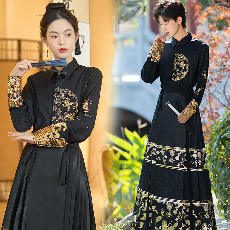 中国風秋冬刺繍黒シャツ漢服男女モデル新中国式明製日常織金馬面スカートセット