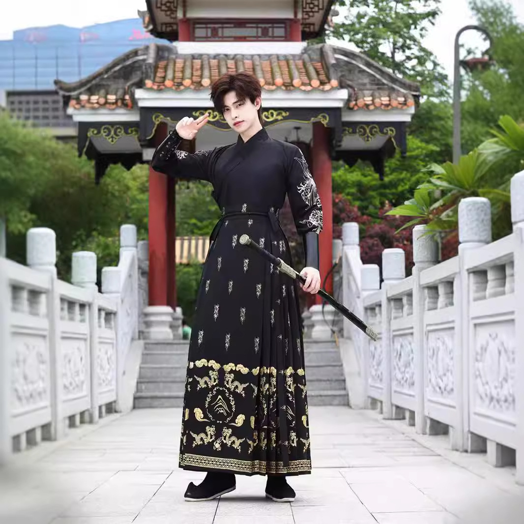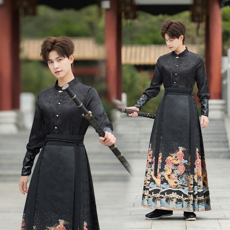 中国風明製飛龍馬面スカートメンズ新中国式交襟ジャカードシャツ漢服男武侠風漢要素