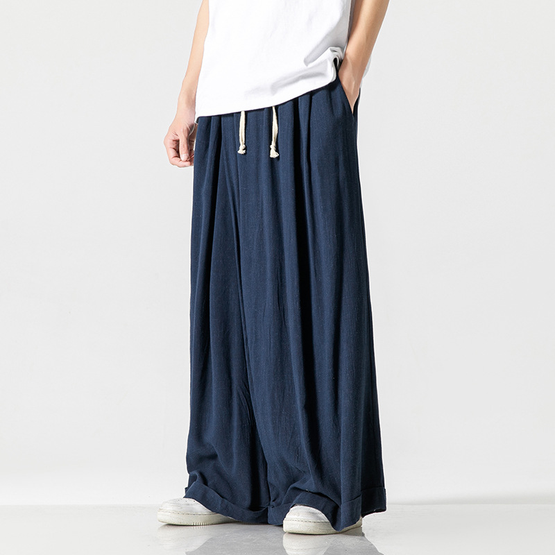 2023新作夏ビッグサイズ中国風綿麻カジュアルハロン九分ズボン改良漢服ツル広脚ズボン男
