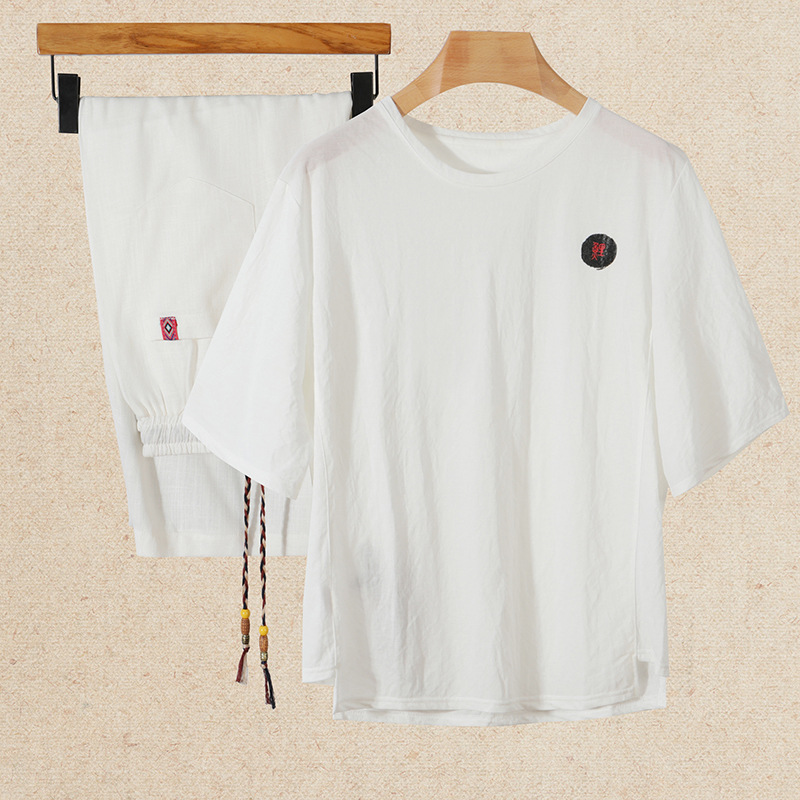 中国風ゆるい綿麻男式スーツ半袖tシャツ + 七分ズボン二点セット漢服復古日系夏服男