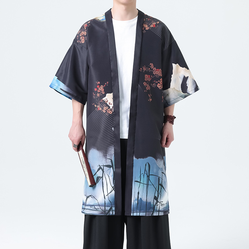 2025 新しいクロスボーダー夏スタイル中国風メンズプリント薄型漢服カーディガンマントミッドレングス半袖ウインドブレーカー