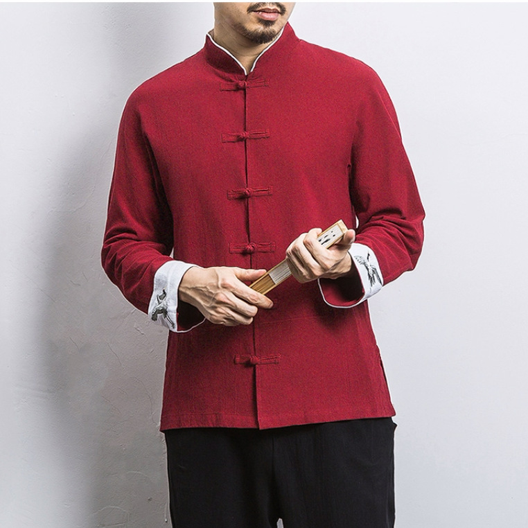 中国風メンズ春の長袖シャツの襟付きカーディガンの改良漢服綿麻盤ボタンの新中国式コート男