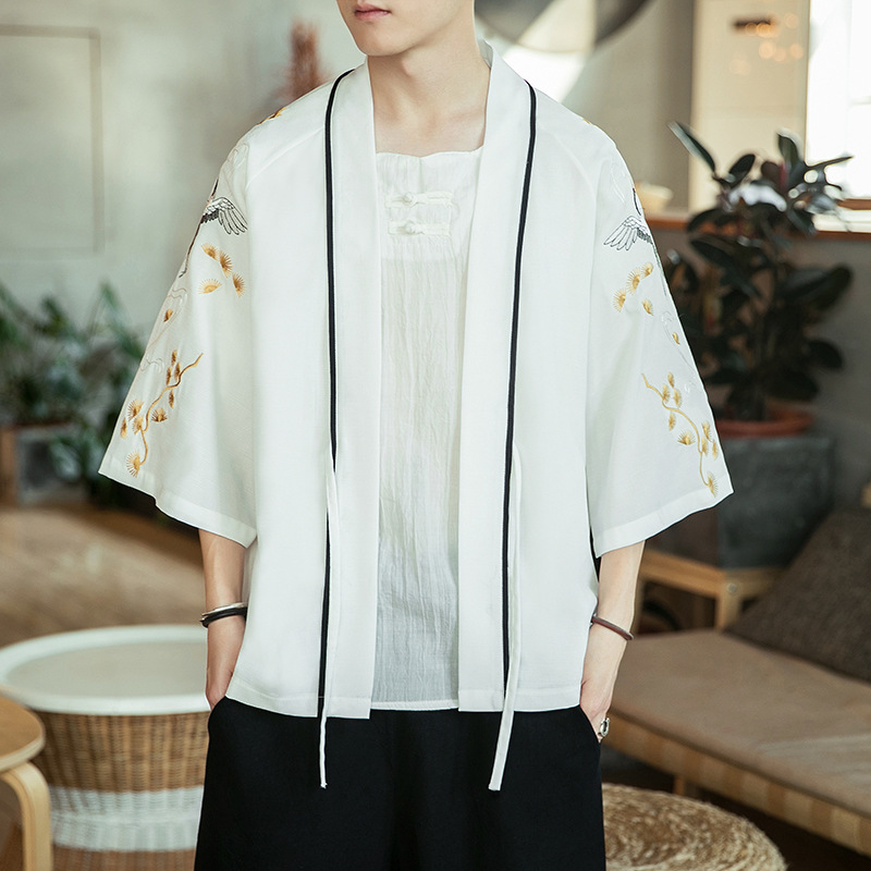 2023夏の新型中国風仙鶴着物カーディガン男性日本式レトロ大サイズプリント道衣漢服男性