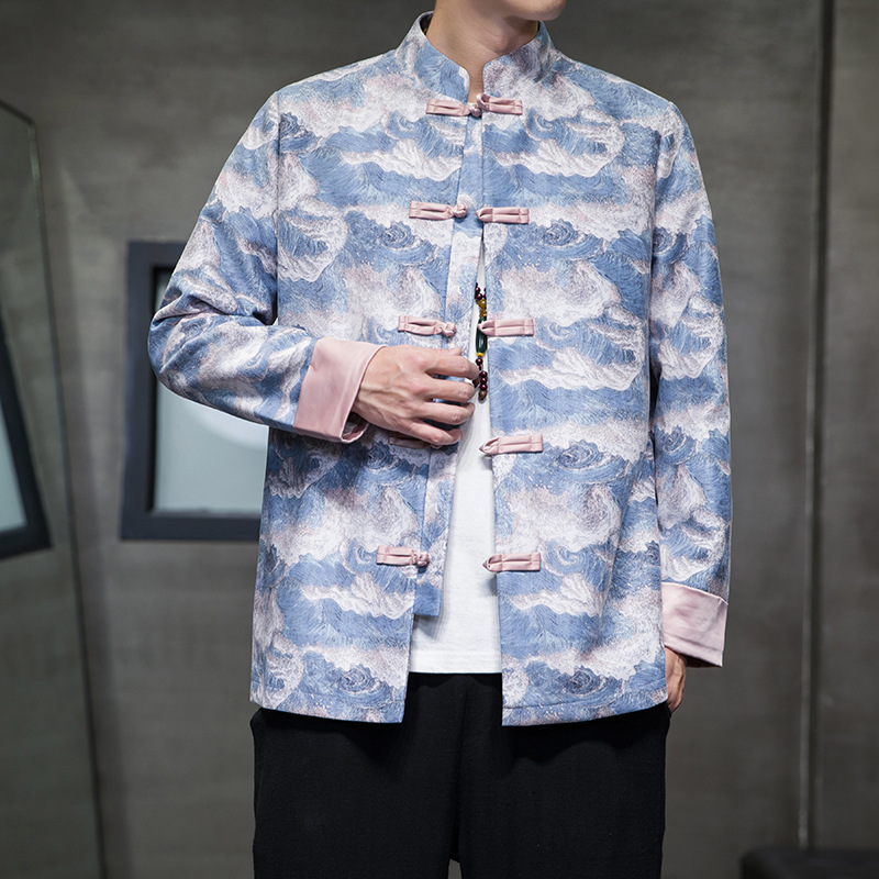 2023秋冬新作中国風メンズプリント波中国式唐装漢服ジャケット大きいサイズゆるいコートブーム