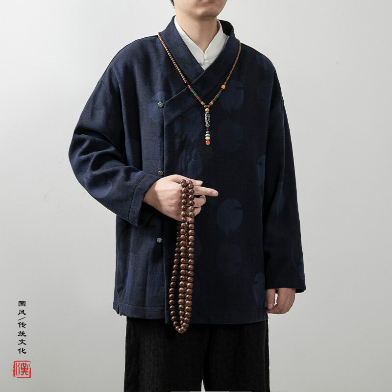2024秋冬新作中国風メンズ綿麻ジャカード改良漢服加毛新中国式コート
