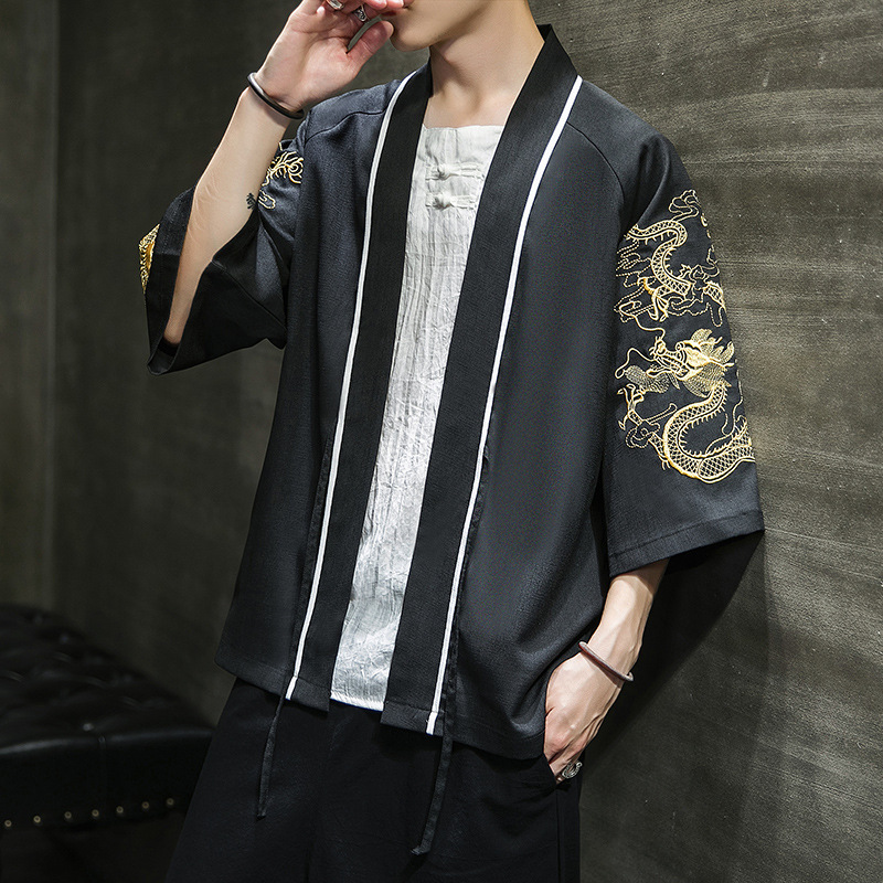 夏の新型中国風メンズファッション龍鳳刺繍七分袖カーディガン
