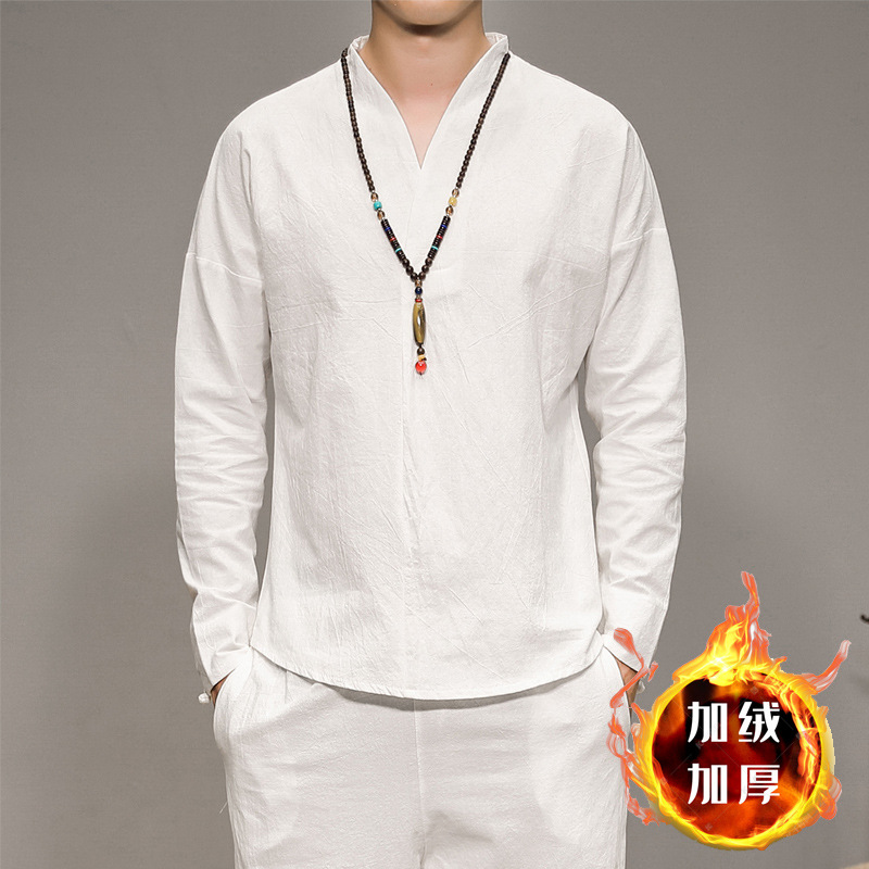 秋冬の中国風の漢服とベルベットの厚い長袖のシャツの綿麻の交差する襟の純色の大きいサイズのカジュアルな唐の服装の男性