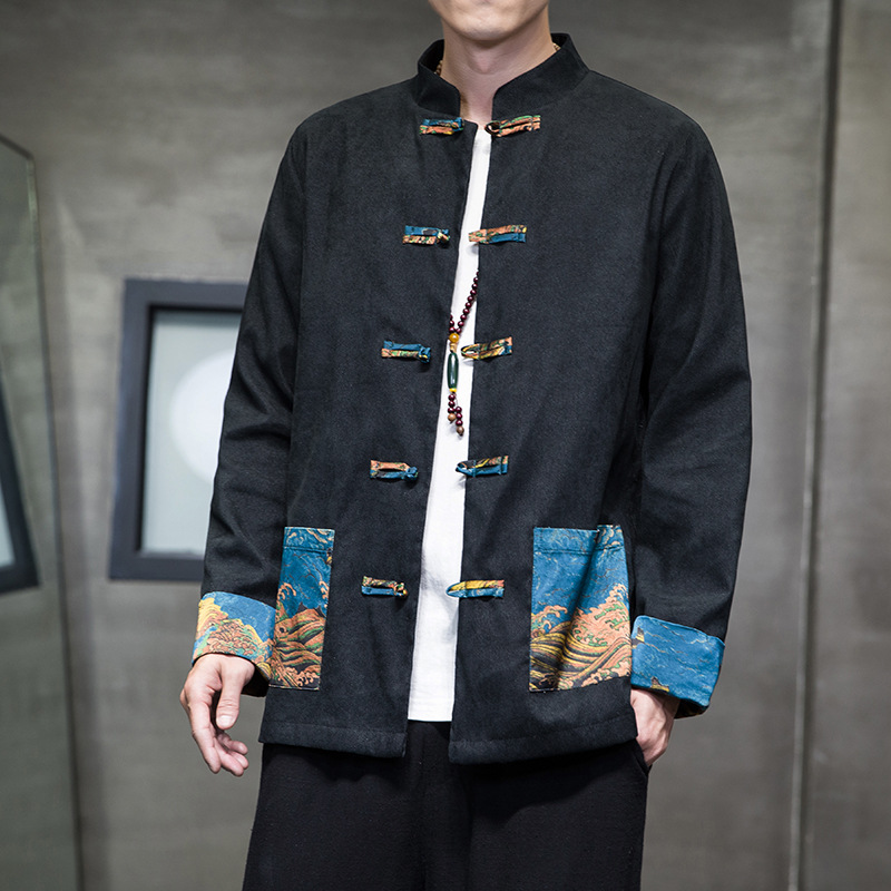 2023秋冬の新型の大きいサイズの中国風の紳士服のコーデュロイの復古的な中国式の唐の服装の漢服のジャケットのコートの潮