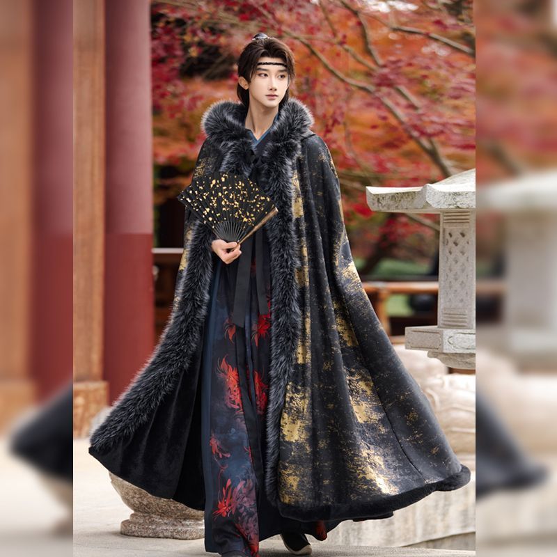 男女同モデルの大ぶりマント漢服秋冬の長い毛の襟とベルベットの厚い保温マントの高級感のあるマント