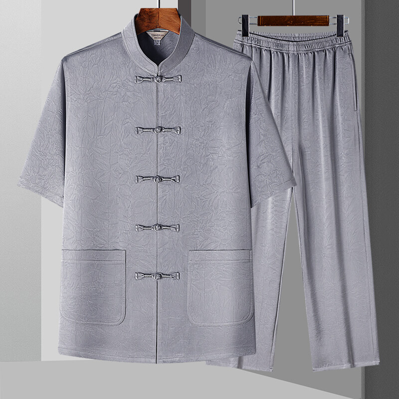 T509P70中国風立襟刺繍盤ボタン漢服二点セット夏氷糸半袖セット父装男