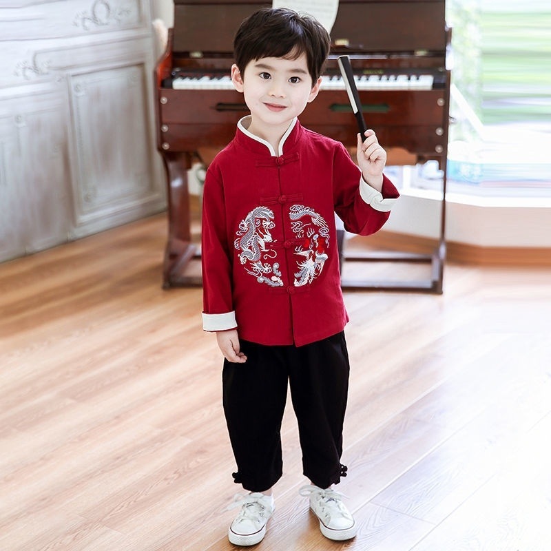 中国の伝統的な漢服衣装中国の龍刺繍綿とリネン長袖服宋時代の男の子の漢服夏の薄いスーツお祝い
