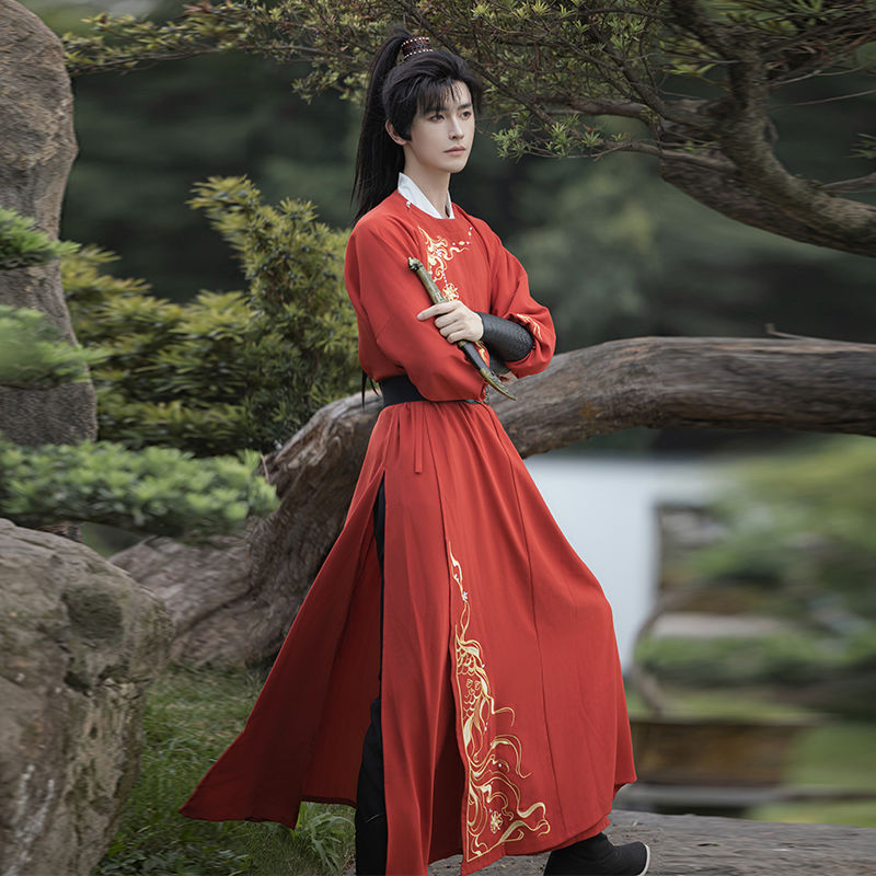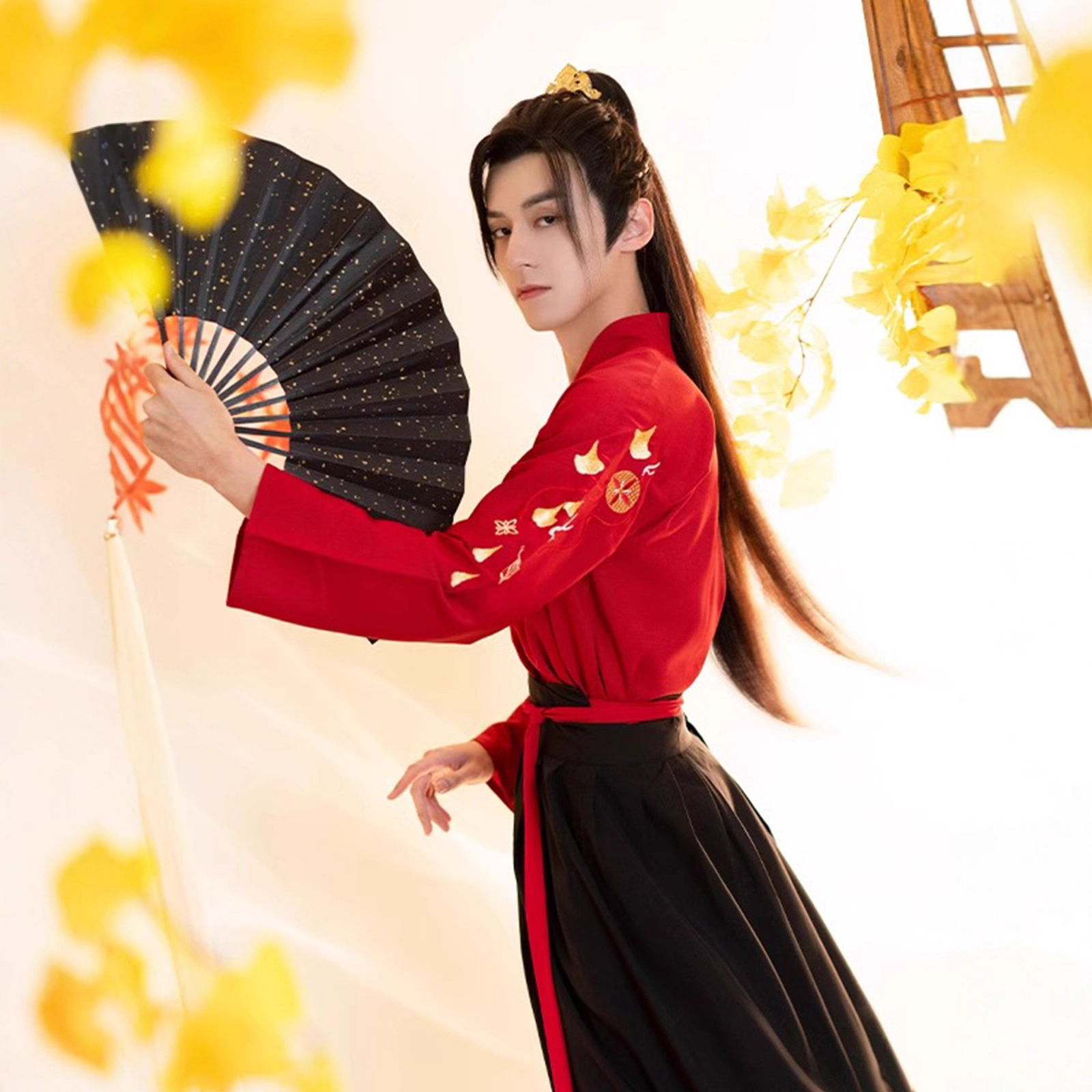 新中国風男中国風漢要素刺繍交襟長袖箔押し馬面スカート赤武侠風cpセット