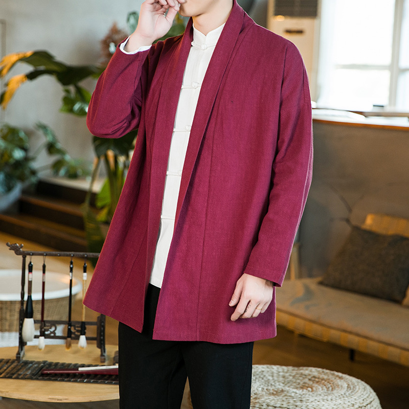 Cod 18中国風綿麻風衣男襟開きゆったりカジュアル長着漢服マント対襟道衣居士コート