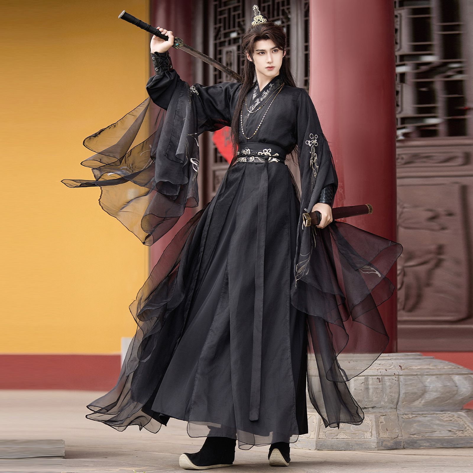 漢服メンズ黒魏晋武侠風メンズ古着新中国式古風侠客学