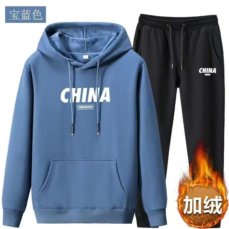 ベルベットの男性は秋冬に帽子をかぶって、大きいサイズのスポーツスーツを厚くして、ゆったりとしたカジュアルな長袖のズボンを二つセットします。