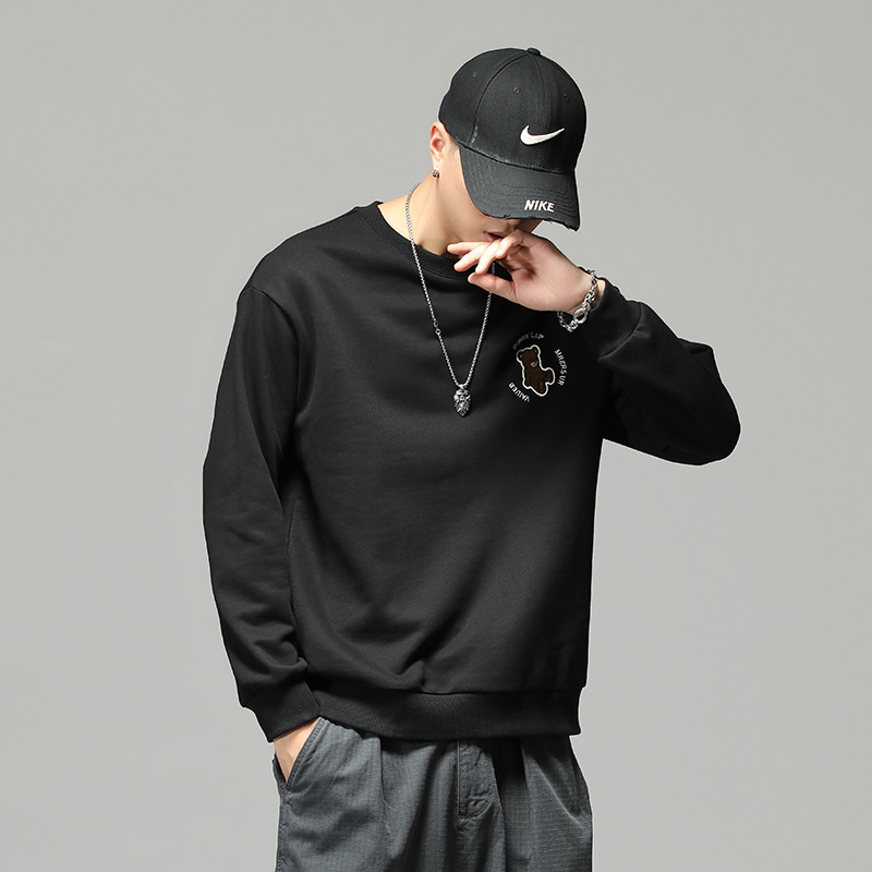 3015 | 大きいサイズのメンズ春用ラウンドネックセーター、シンプルな漫画のクマプリントトップス、ゆったりとしたメンズインナーウェア