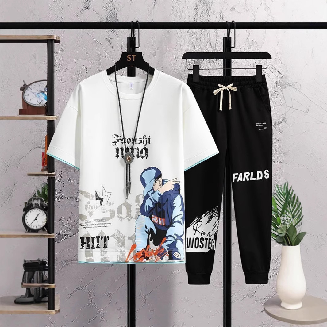 ユーススポーツスーツメンズ夏大きい子供半袖Tシャツゆったりハンサム服中学生トレンドブランド紳士服