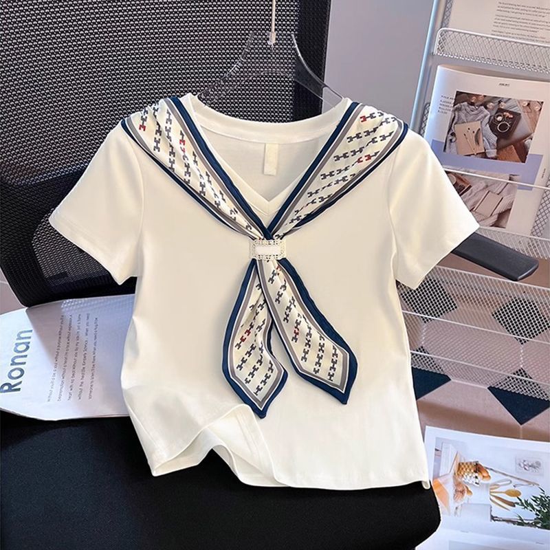特大サイズデザインシルクスカーフショルダー半袖Tシャツ男女兼用夏甘くてクールなカレッジスタイル年齢軽減Vネックシャツトップ