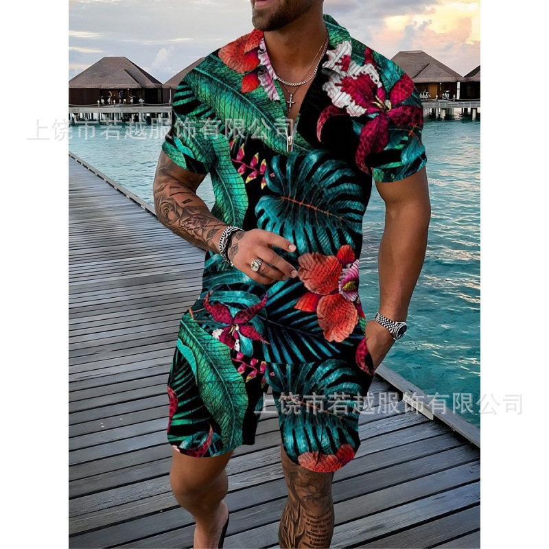 2025 夏アマゾン独立系植物柄ポロシャツメンズカジュアル大きいサイズ半袖ショーツスーツ