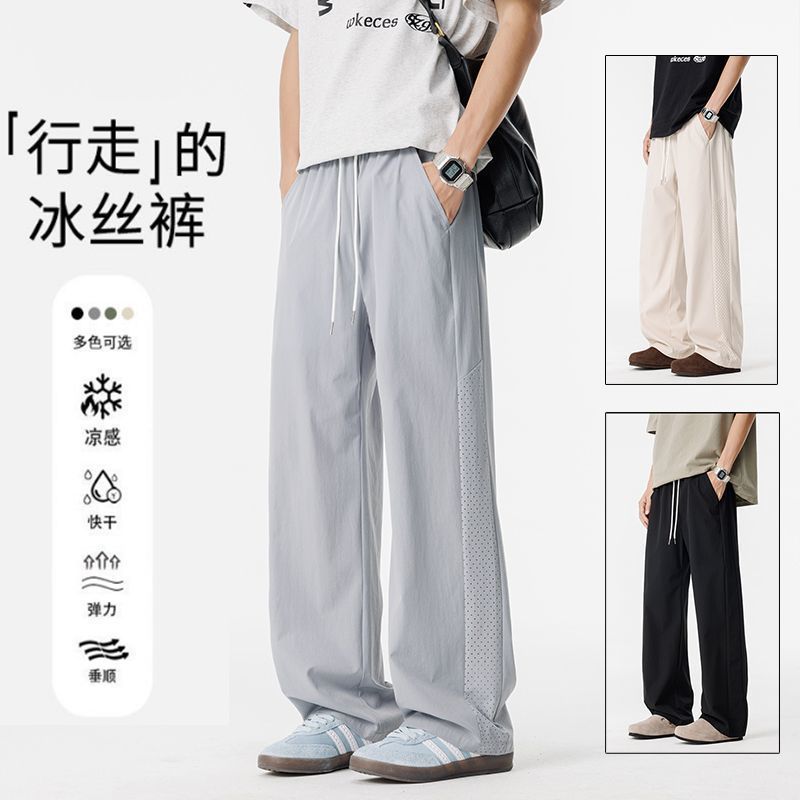 春夏の男性用のハイエンドの薄いアイスシルクパンツ、男性のトレンディなカジュアルパンツ、スポーツルーズストレートワイドレッグパンツ