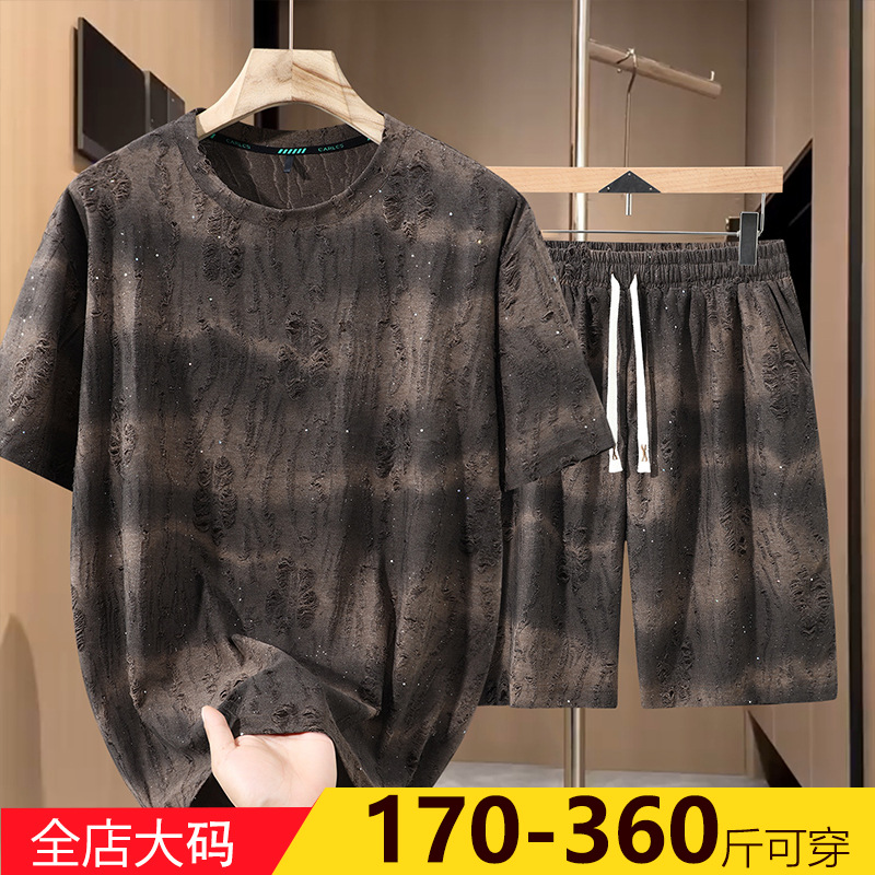 特大サイズ 150kg 夏メンズプラスサイズ半袖スーツリッピングラウンドネック半袖 Tシャツショーツ 2 点セット