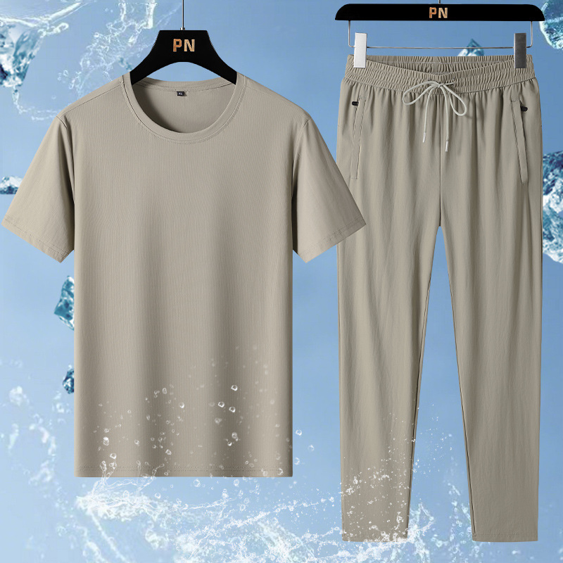 2303-1 ショートセット エンティティツーオープン 夏 メンズ アイスシルク 吸湿性 通気性 スポーツ レジャー ラウンドネック 半袖スーツ