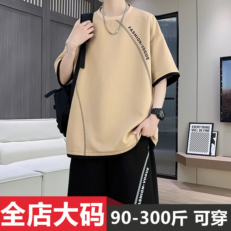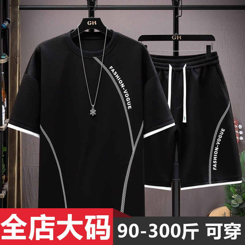 ファットマン大きいサイズ半袖スーツメンズ夏のトレンドファッション紳士服新しいTシャツ5点パンツスポーツ2点セット