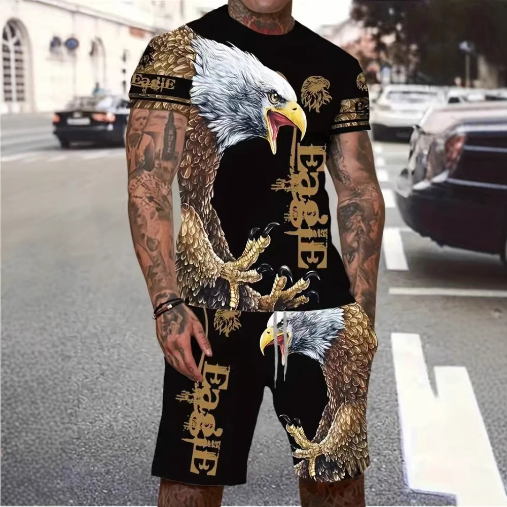 ヨーロッパとアメリカの貿易クロスボーダー新しい大きいサイズイーグルメンズカジュアルラウンドネック半袖3Dデジタルプリント人気のTシャツセット