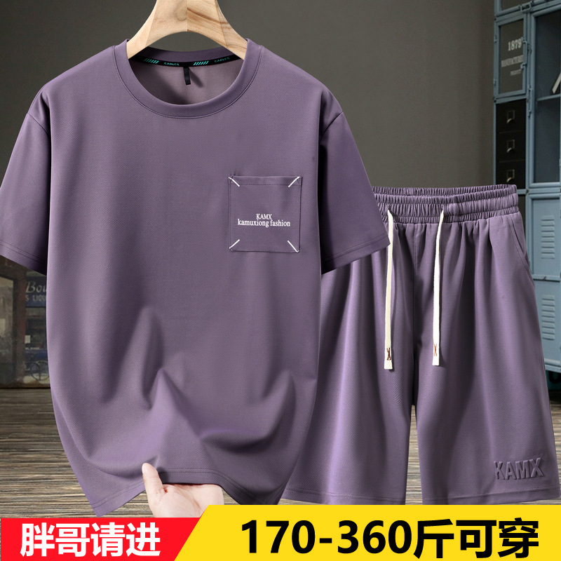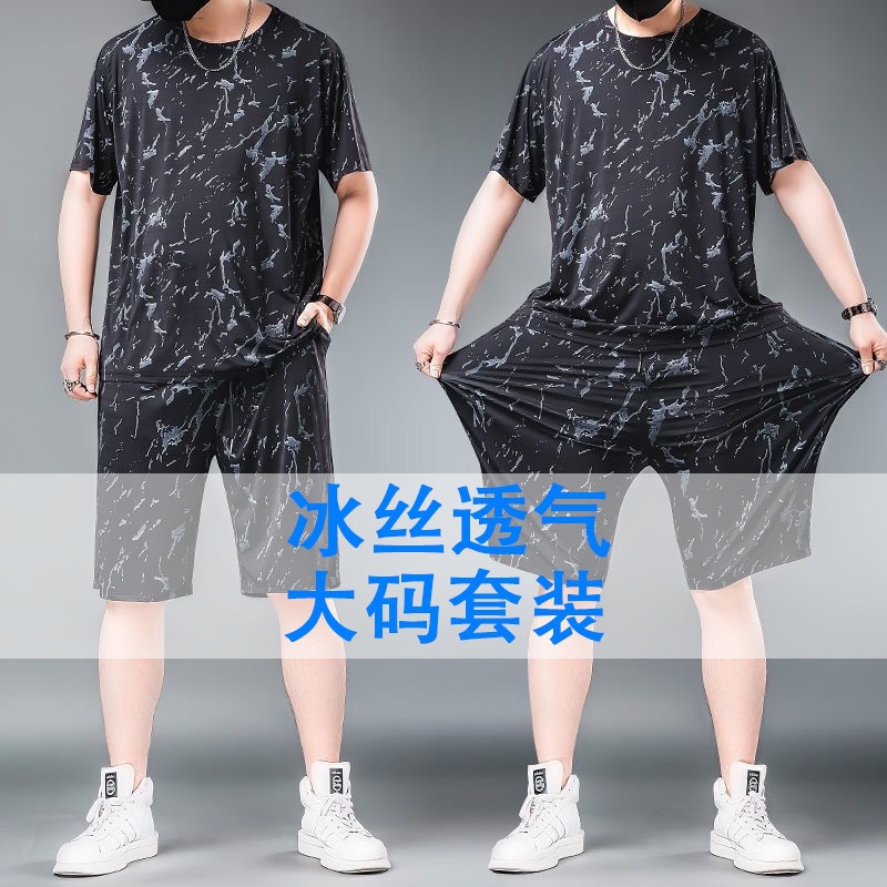 夏のアイスシルク半袖スーツメンズカジュアルルーズプラスファットプラスサイズ 150kg 半袖 Tシャツショーツセット