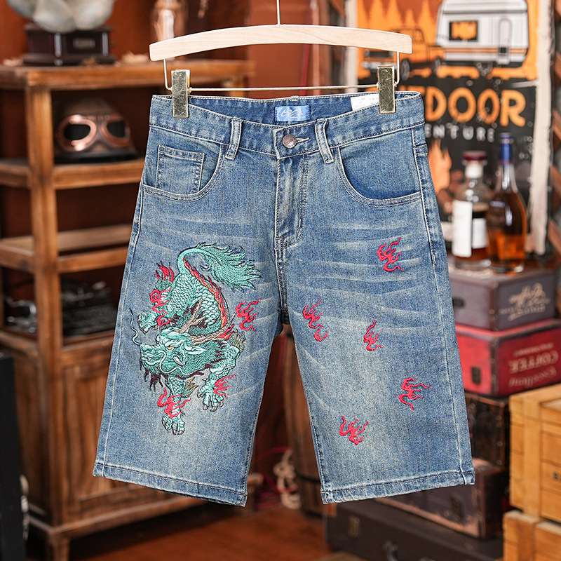 国民的トレンド刺繍デニムショートパンツメンズトレンド5点パンツゆったり大きいサイズ太った人刺繍5点