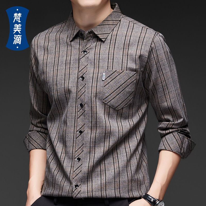 ファッションのお父さんは桑のシルクの亜麻のストライプの長袖のシャツのゆったりしているボタンの上着の秋の中高年の紳士服を詰めます。