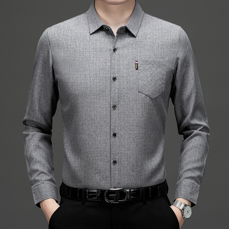 メンズの真のポケットの長袖のシャツの男性のシャツの春秋の金のゆったりしているカジュアルな純色の寸のシャツの上着の中年のお父さんの服