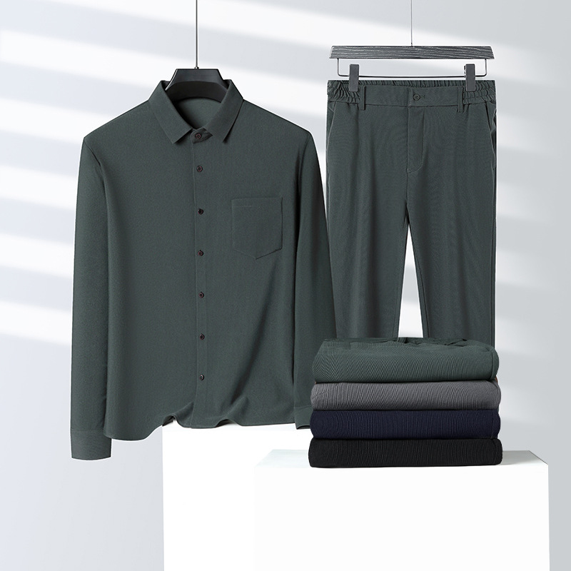コーデュロイ長袖シャツスーツ メンズ 中高年 カジュアルパンツ シームレスツーピースセット メンズ 中年 ビジネスカジュアルスタイル