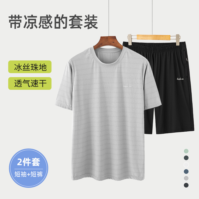 中年のお父さんの夏服のレジャーのスポーツのスーツの男性の半袖の半ズボンの氷の糸の速乾のネットの目の中で老年の2つのセット