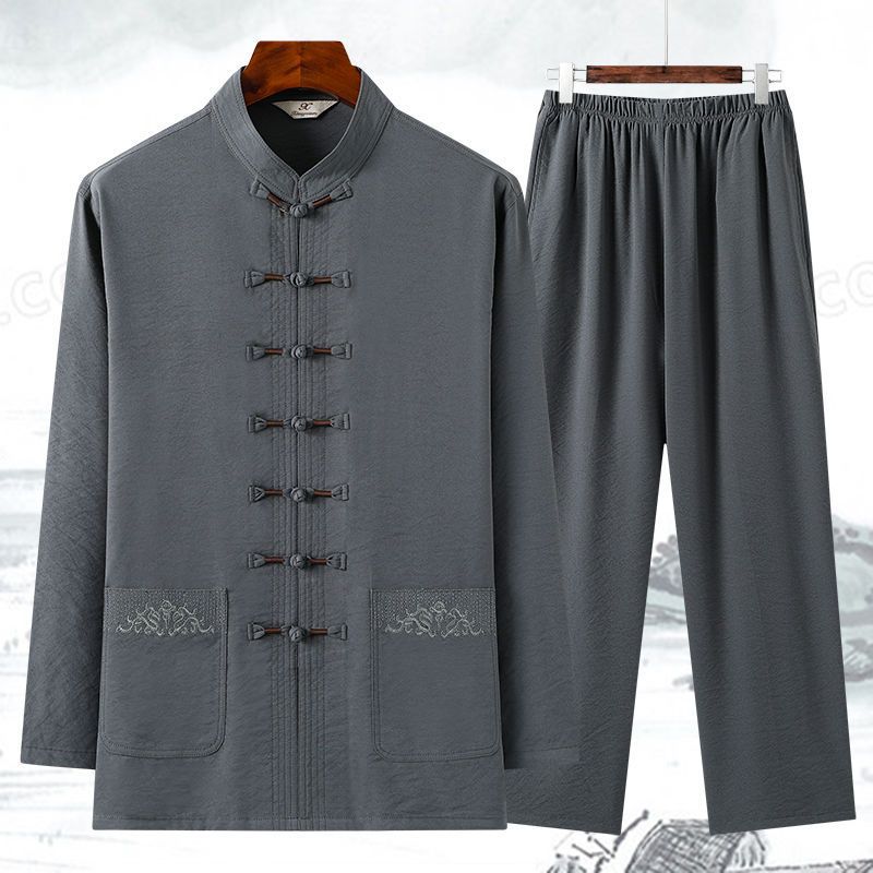 山力達迪中高年唐装男長袖氷糸シャツ夏の父セット夏服老人おじいさん服