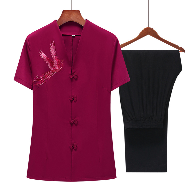 夏薄手でエレガントな半袖ツーピースレトロトップ半袖中国風スタンドカラー半袖高品質シャツスーツ